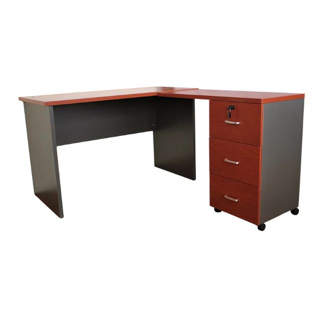 Cubierta en melamina color cerezo, resistente al agua, manchas y rayaduras. Ideal para uso diario intensivo en oficinas.